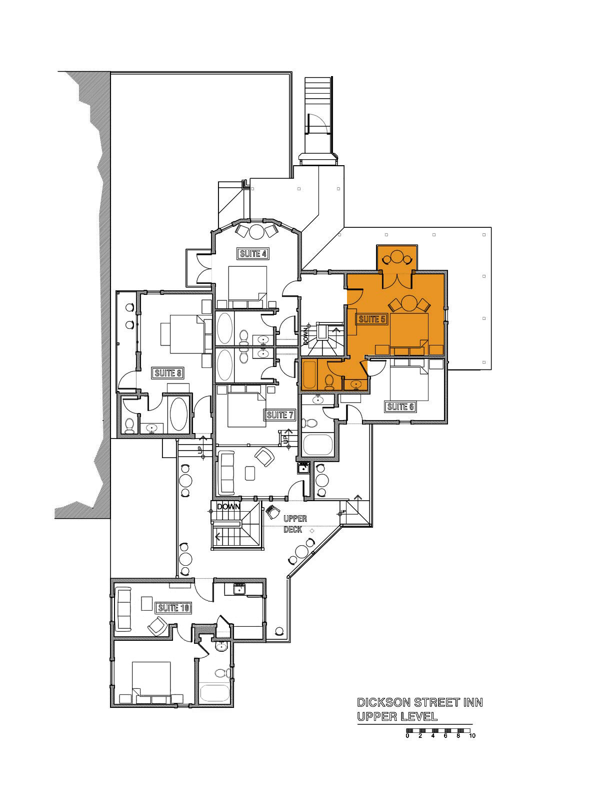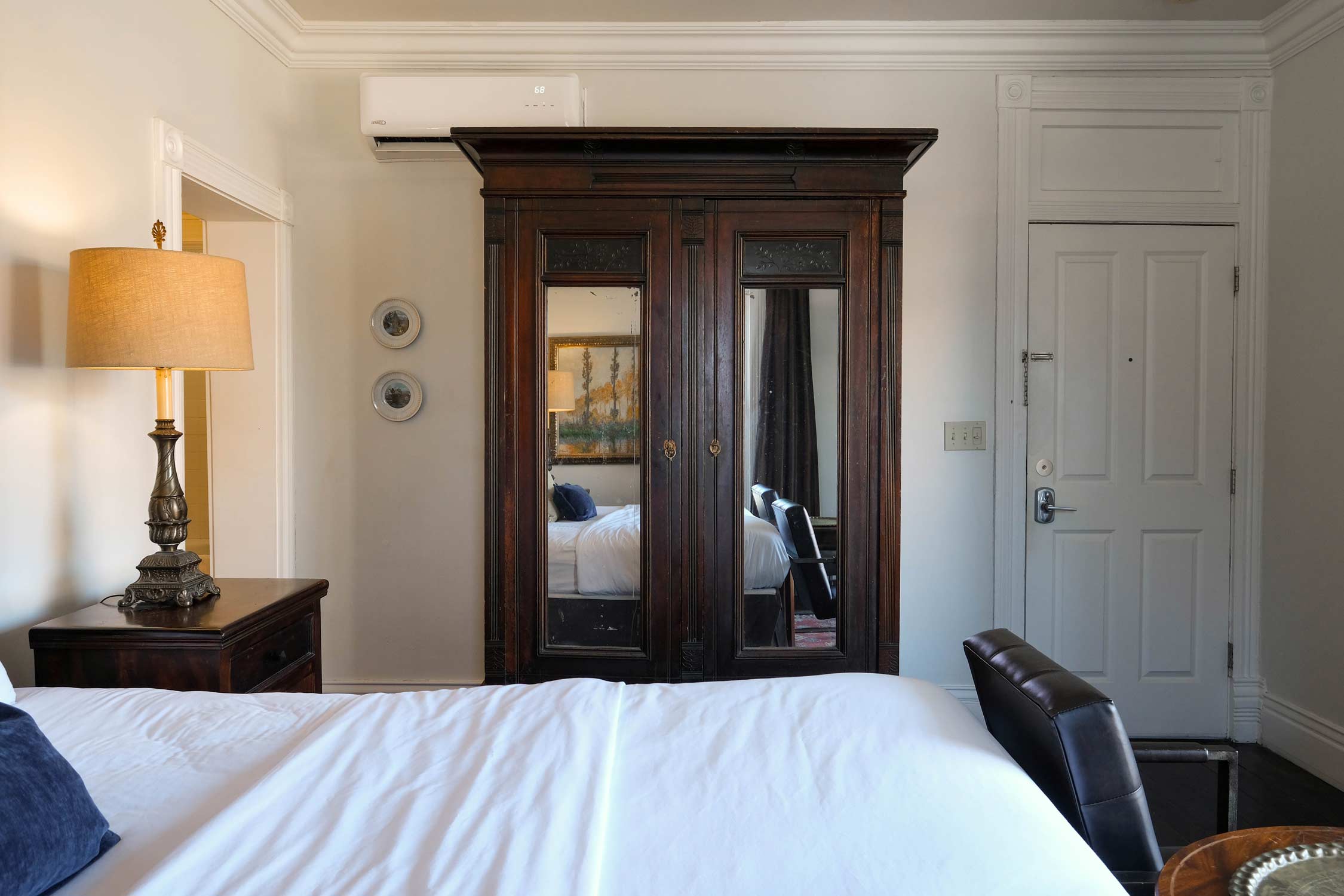 Located upstairs in the Main House, this Signature King is sometimes referred to as “The Honeymoon Suite”. Enjoy high ceilings, a small sitting area, chandelier, and white marble vanity, complemented by antique furnishings and decor. Step onto the private French door balcony for sweeping views of Dickson Street, or look west to Old Main on the University of Arkansas campus. This room can be combined with Room 6 to make a larger suite.